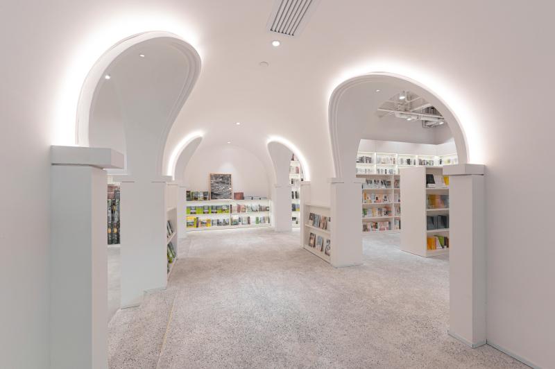 “渡·书店”水街的两侧有多个白色调的拱门,这是根据南沙炮台和传统建筑抽象而来的设计。通讯员供图