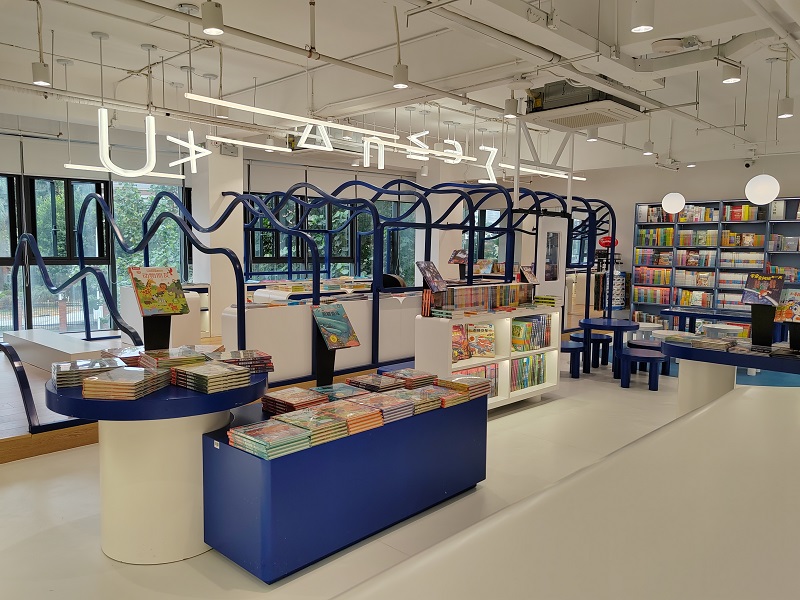 沿着楼梯走上二楼的少儿区,它的设计以广州地铁18号线为概念主题。高速列车隐喻着南沙科技的高速发展,而头上的符号灯代表着数学是科技的根本和基础。“我们希望孩子们抬头发现这些符号时会问身边的大人,这些是什么?这会在他们心中种下探寻数学和科技的种子。”书店设计团队成员全希希如此解释。