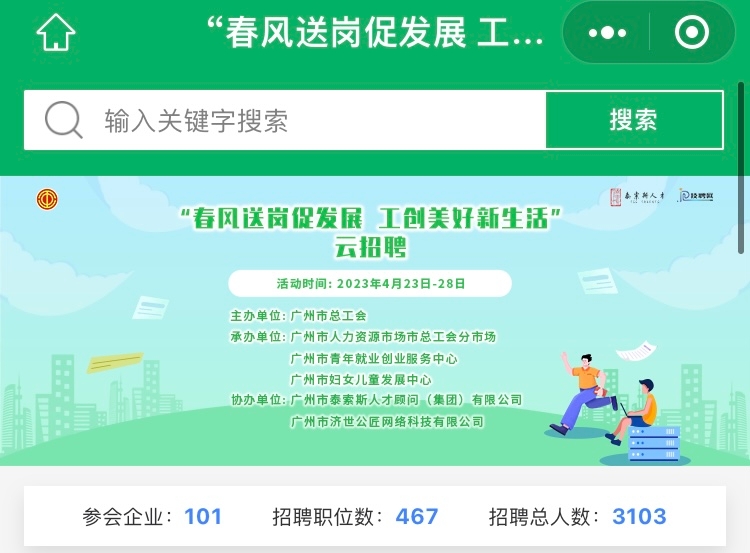 广州日报记者4月21日获悉,“春风送岗促发展 工创美好新生活”云招聘将于4月23日-28日举办。本次云招聘将有101家企业参加,招聘467个岗位,招聘总人数为3103人。招聘的岗位包括有操作工、采购文员、律师助理、储备店长、电器工程师等等。求职者可搜索微信小程序“技聘网”进入招聘网页。