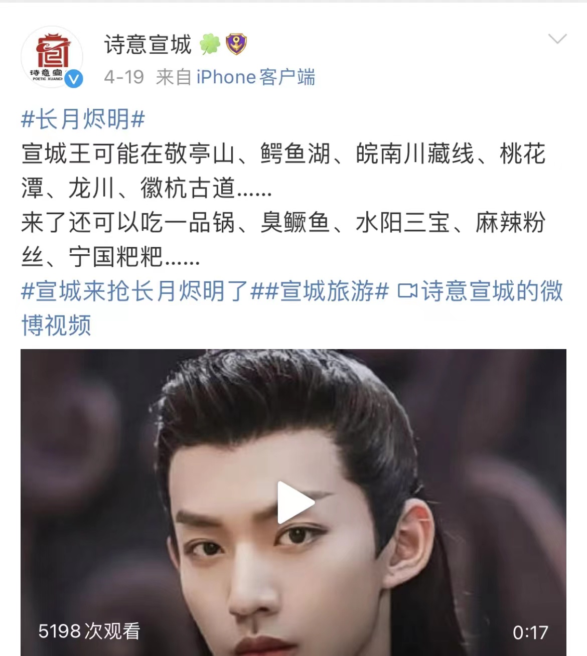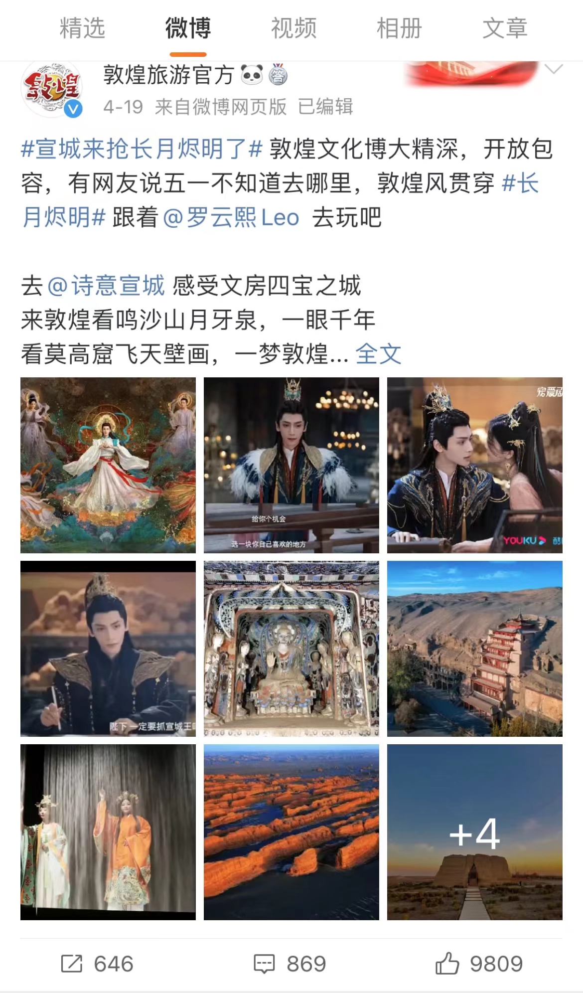 有趣的是,《长月烬明》在美术设计上曾取材于敦煌文化,包括从敦煌壁画中汲取灵感的服饰装造、宛若敦煌飞天降世的上清神域仙子、根植于敦煌文化的哲学思想与人文精神,因而此次安徽“火”了之后,甘肃也“不甘示弱”,派出敦煌,“敦煌旅游官方”微博带着#宣城来抢长月烬明了#话题发布了一条微博,并与“诗意宣城”互动,表示:“去宣城感受文房四宝之城;来敦煌看鸣沙山月牙泉,一眼千年。” #网友集齐长月烬明打卡地#因而一度成为社交媒体上的热议话题。