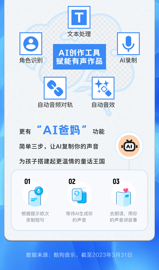 酷狗还积极引入AI创作。通过有声AI技术,文本处理、角色识别、AI录制、自动音频对轨、自动音效等各环节一气呵成,大大提高创作效率,并为用户提供AI有声小说、AI助眠音乐、AI相声评书等多种内容。这一模式不仅助力创作者们提高效率,也为有声书行业带来内容生产的新思路和新模式。酷狗还针对家长人群提供了“AI爸妈”功能,通过“录制短句—AI生成—选择故事书”三个简单步骤,就能帮助家长们用自己的声音来读儿童书本,为孩子搭建起一个更温情、细微的童话世界。