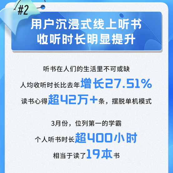 报告显示,人们花在有声书上的时间越来越长。和2022年相比,人均收听时长增长了27.5%。3月份酷狗排名第一的听书学霸个人听书时长超400小时,相当于读了19本书。