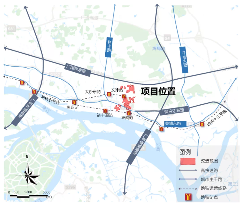 文冲旧村改造项目地处广园快速路南侧,临近黄埔东路,紧邻文冲、双岗地铁站。由于历史发展原因,村域范围大部分土地被政府征收,建设为广州石化、文冲船厂、广州航海学院、污水处理厂等区域重要设施,文冲村部分经济社(石化路以西)已基本完成更新改造,村内剩余土地零碎分散,分为渡头、文元、江北三片。