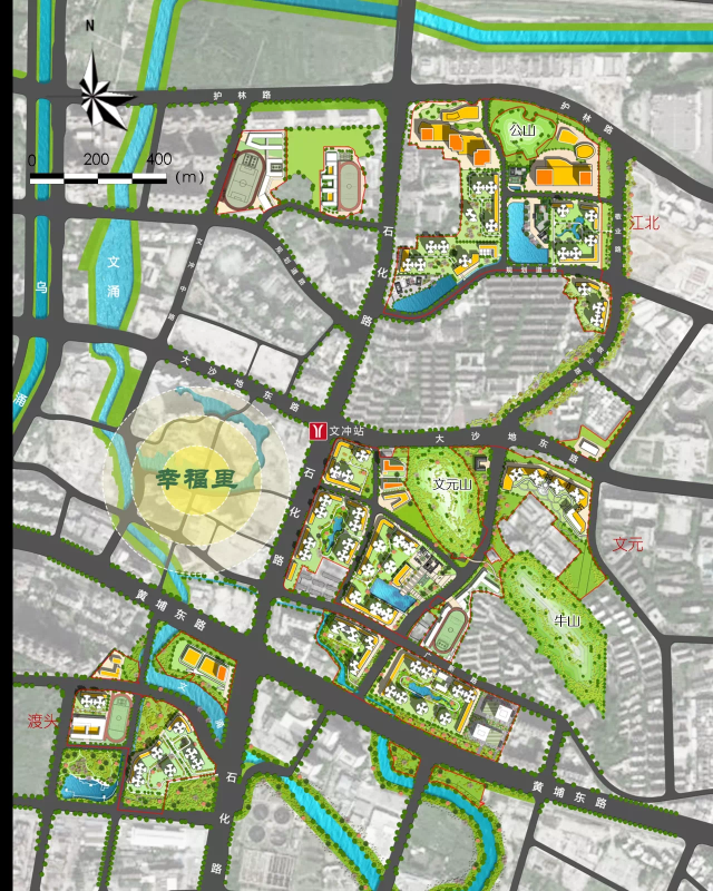改造方案构建蓝绿渗透的公园社区,利用江北公山、文元山、牛山、渡头湿地公园等多样化的空间节点构成文冲带状生态景观格局,构建三大公园、三条碧道生态体系,实现青山绿水之美。此外,打造广府风貌的文化新村,以开放空间及散步道串连历史文化亮点。通过对多处祠堂、风水塘进行原址保留或重建,尊重岭南地方文脉,保留区域传统特色,留住看得见的乡愁。