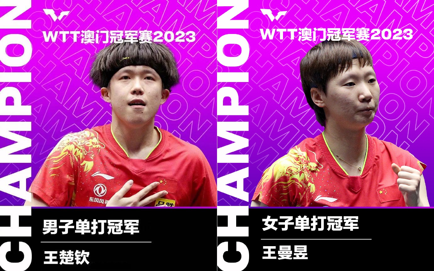 【国乒包揽WTT澳门赛男女单打冠亚军】WTT世界乒联澳门冠军赛23日结束全部项目比拼。男单决赛,中国队选手王楚钦以4∶0战胜队友马龙夺冠,成功卫冕。女单决赛中,王曼昱战胜陈梦,夺得女单冠军。至此,中国队包揽本站赛事男、女单打冠亚军。