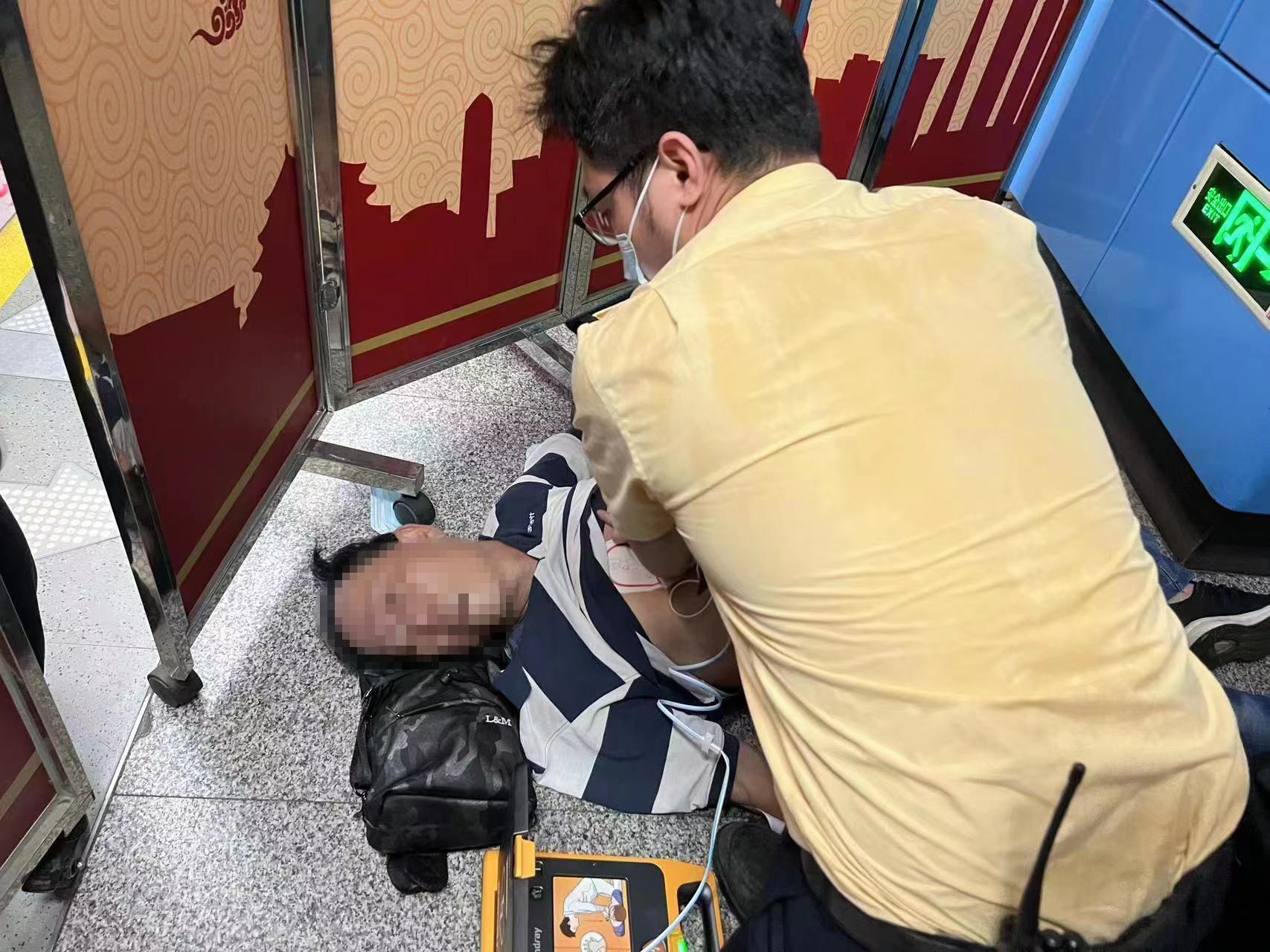 “先生,请问能听到我说话吗?”吴志勇蹲下查看,并从女乘客许女士口中得知丈夫黄先生有心脏病史,原计划去医院复诊,不曾想在地铁上突发不适,身上还贴有心电检测的设备。此时,吴志勇发现男乘客不停地抽搐,呼吸困难,且开始出现紫绀症状,他轻拍其肩膀数次呼唤都没有任何回应。吴志勇用手在鼻孔处试探,发现其呼吸十分微弱,便两指并拢按压乘客颈动脉,也感觉不到脉搏跳动。察觉到情况危急,吴志勇一边呼叫车控室迅速派人携带AED到场支援并拨打120,一边与家属将男乘客放平,并为他实施心肺复苏,一场生死营救就此展开。