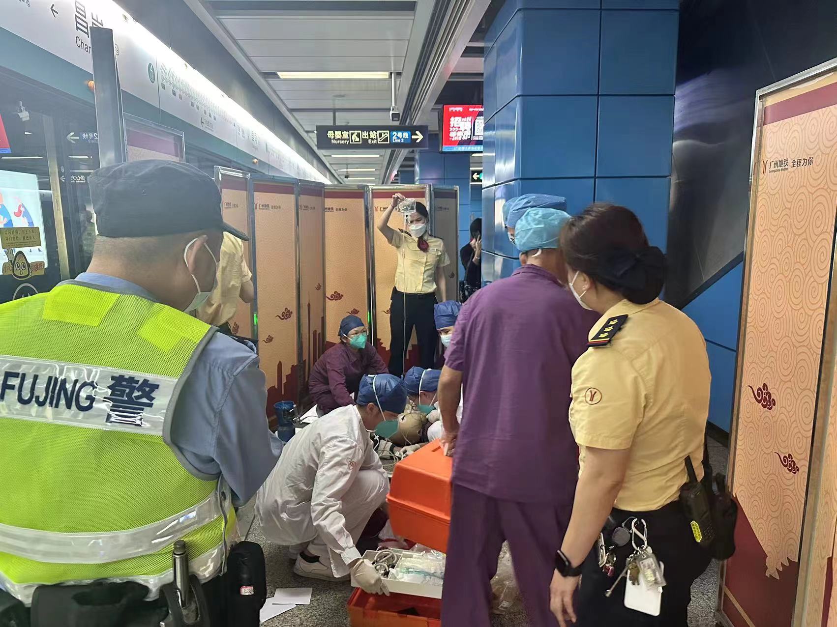 “有人在站台晕倒了!”4月6日13:55,昌岗站站务员吴志勇正在八号线站厅巡视,多名从站台上来的热心乘客冲他招手喊道。吴志勇闻声赶到站台,只见往万胜围方向的9号门附近,一名年约70多岁的男乘客躺在同行的女乘客腿上,女乘客正慌张地拍打并呼唤着。