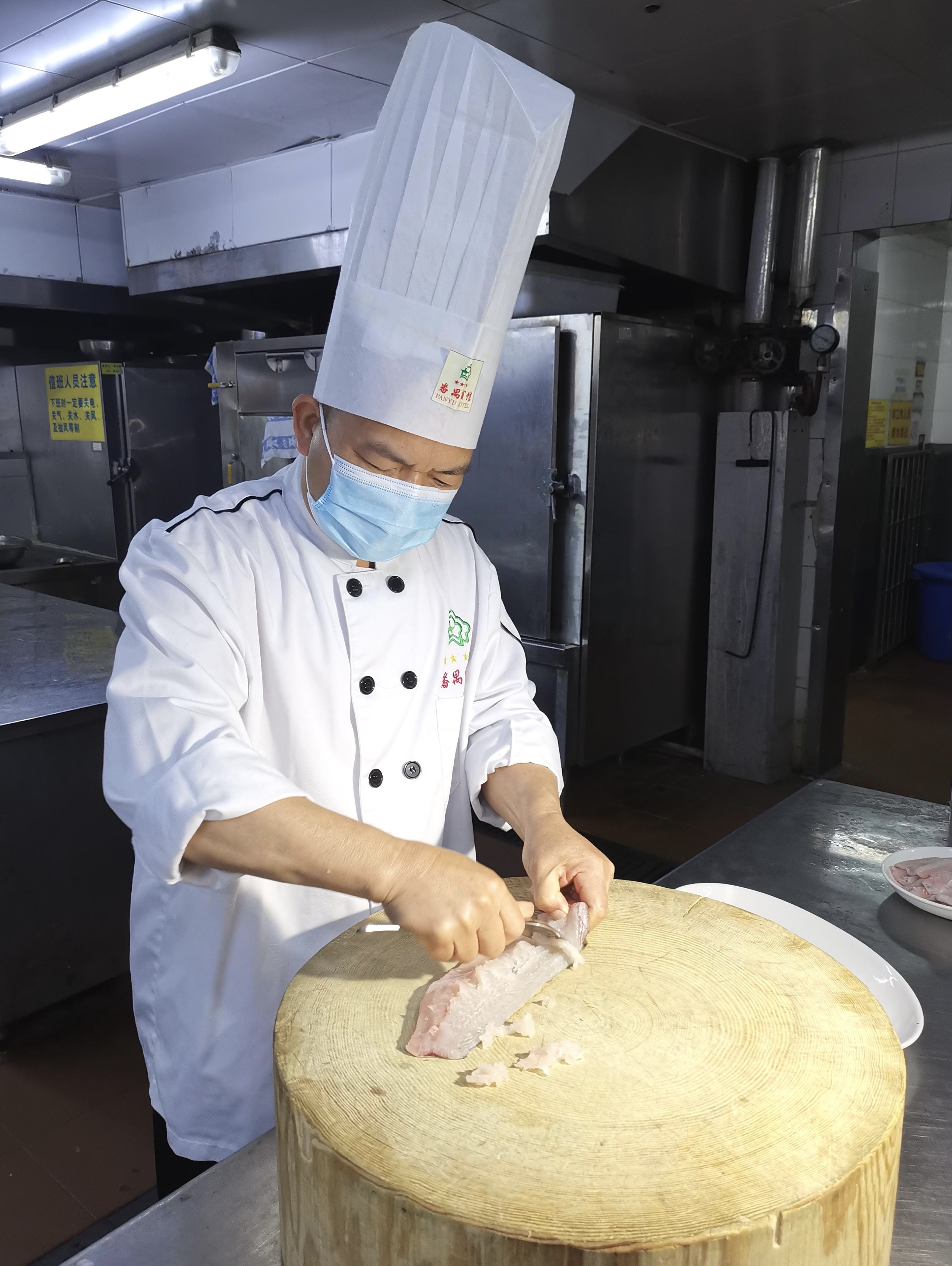 番禺宾馆点心部部长蔡伟欢有着30多年的点心制作经验,捞鱼、去皮、起骨、刮茸,整套动作如行云流水、麻利干练。