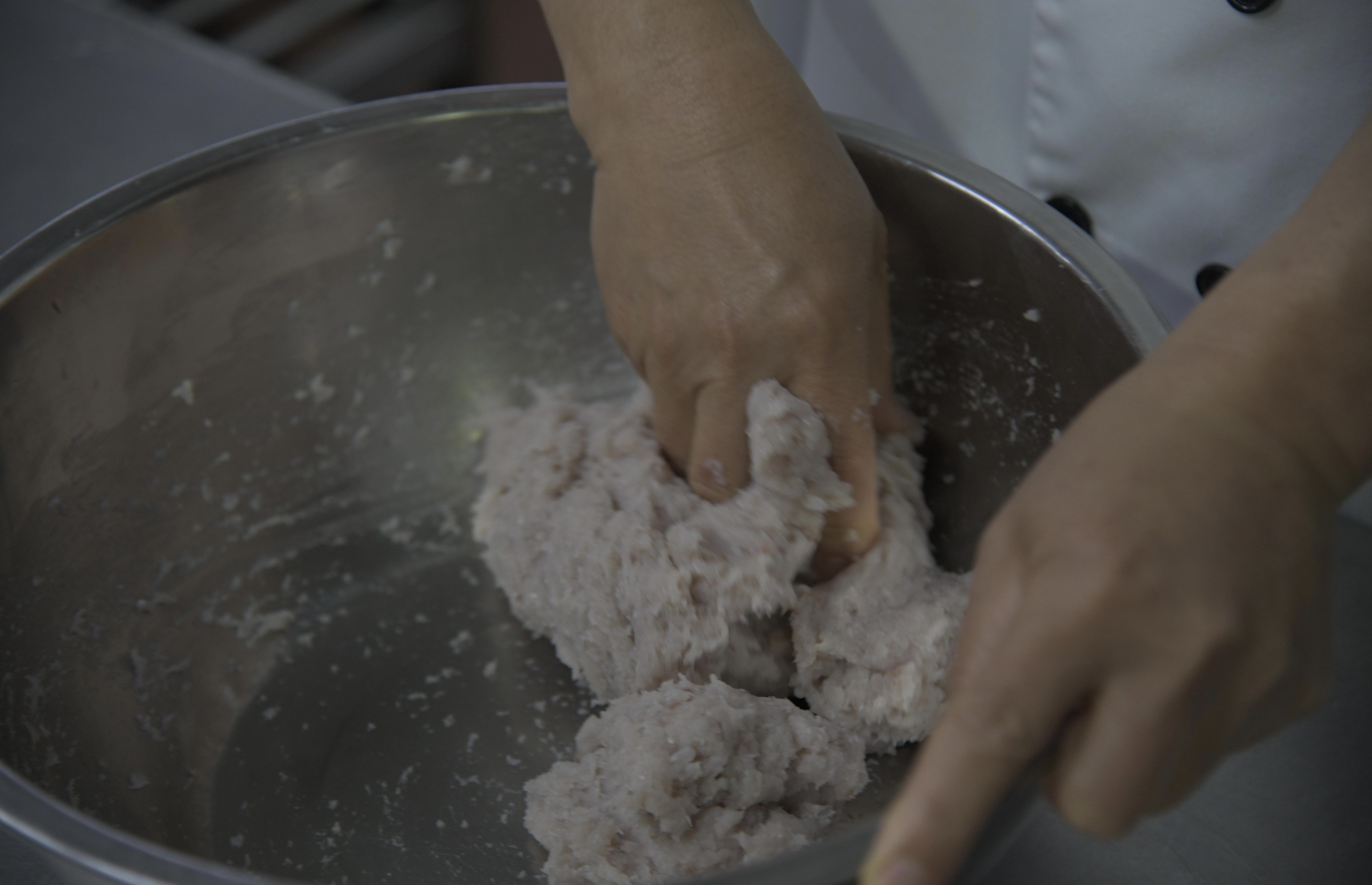 “‘市桥白卖’为什么吃起来弹、滑呢?用手反复搅拌、摔打,打到鱼肉起胶至关重要。”蔡师傅说道。只见他用手将鱼茸着一个方向搅拌,搅至起胶粘手,再倒入肉茸、盐、胡椒粉、虾米等馅料拌匀。蔡师傅技艺娴熟地用刀面按压,搓出一张张晶莹剔透的白皮,用白皮包上鱼胶馅造型至烧卖形状,随后,蔡师傅要完成最后的点睛之笔。