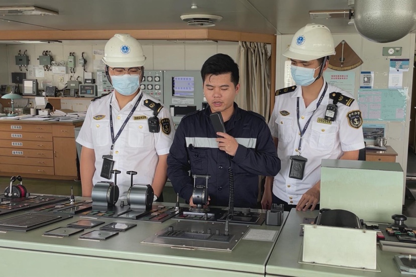 4月27日湛江海安新港,海事执法人员正对即将投入营运的客滚船进行开航前检查。据悉,湛江海事部门在假期前将对客滚船实施安全检查全覆盖,同时增派海巡船在琼州海峡进行巡航值守,密切关注客滚船航行动态和海面气象情况,做好应急准备,全力保障客滚运输安全。