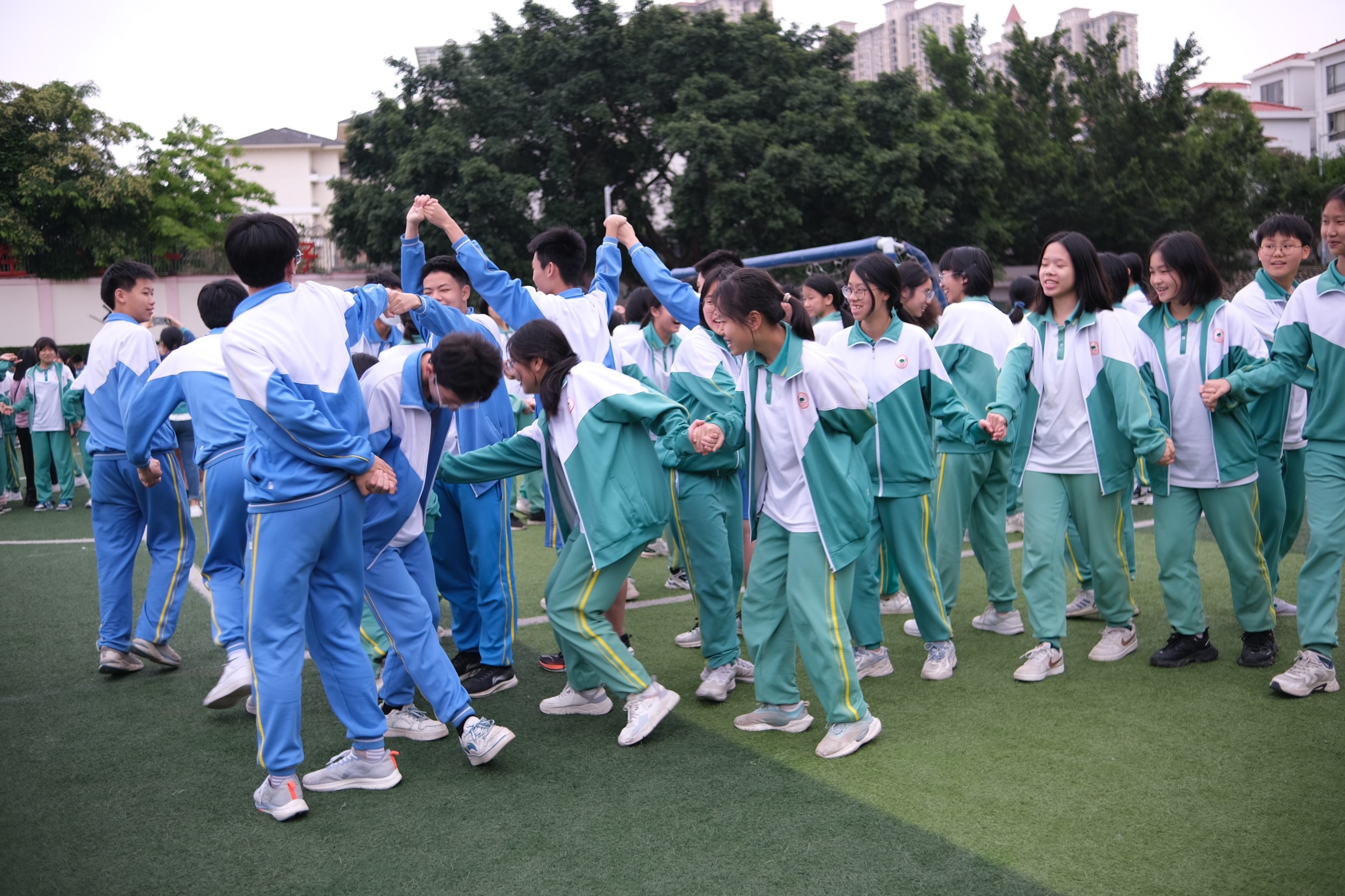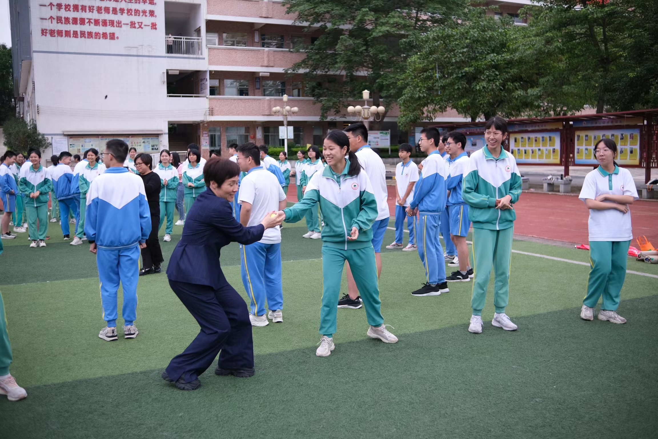 欢声笑语中,同学们既从团队中找到了支持,也用自己的能量支持着团队。在活动最后一个环节,学生欢快奔跑穿梭在同窗搭起的助威长廊,班主任老师和两位校长在终点为他们戴上“祝福奖牌”。