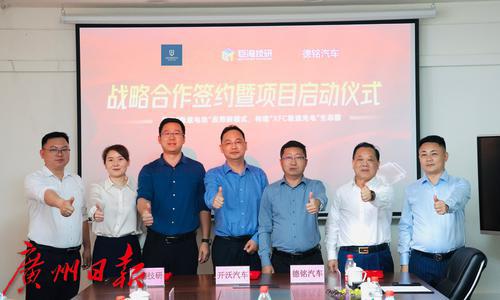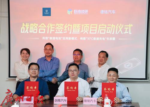 近日,广州巨湾技研有限公司(简称“巨湾技研”)与江苏开沃汽车有限公司旗下品牌创维汽车(简称“创维汽车”)、广州德铭汽车销售有限公司(简称“德铭汽车”)在巨湾技研德道产业园举行战略签约仪式,三方拟在新能源汽车超快充电池和超级快充解决方案、全国超充生态建设等方面开展深入合作,共同推进XFC(eXtreme Fast Charing)极速电池的应用及发展。