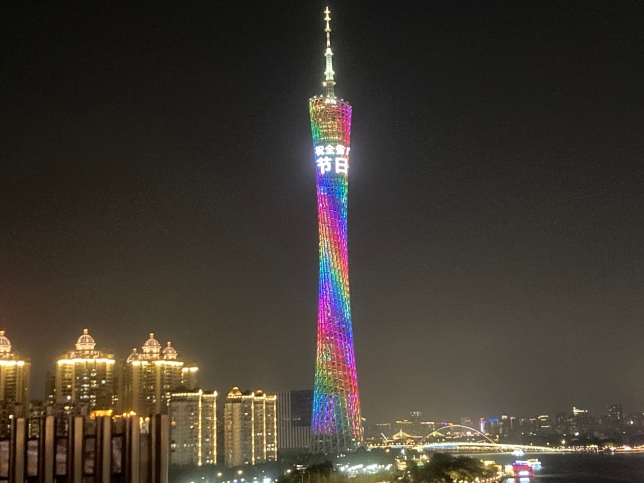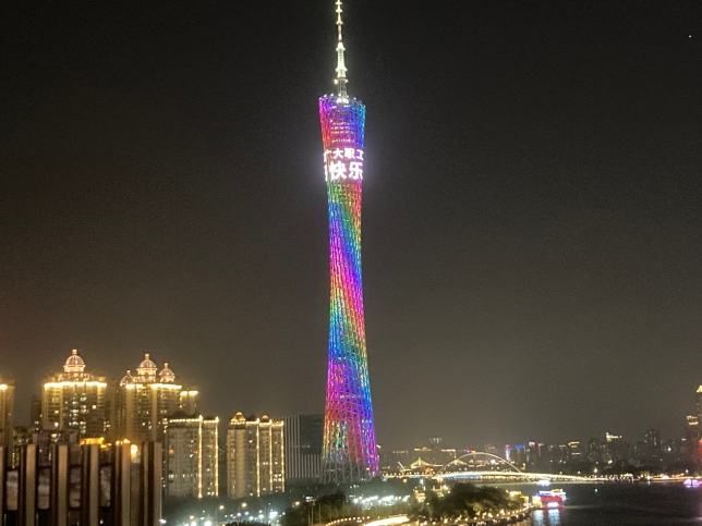 第133个“五一”国际劳动节即将到来,4月28日晚,广州塔点亮节日祝福,滚动播放“祝全省广大职工节日快乐”和“致敬羊城劳动者”字样。