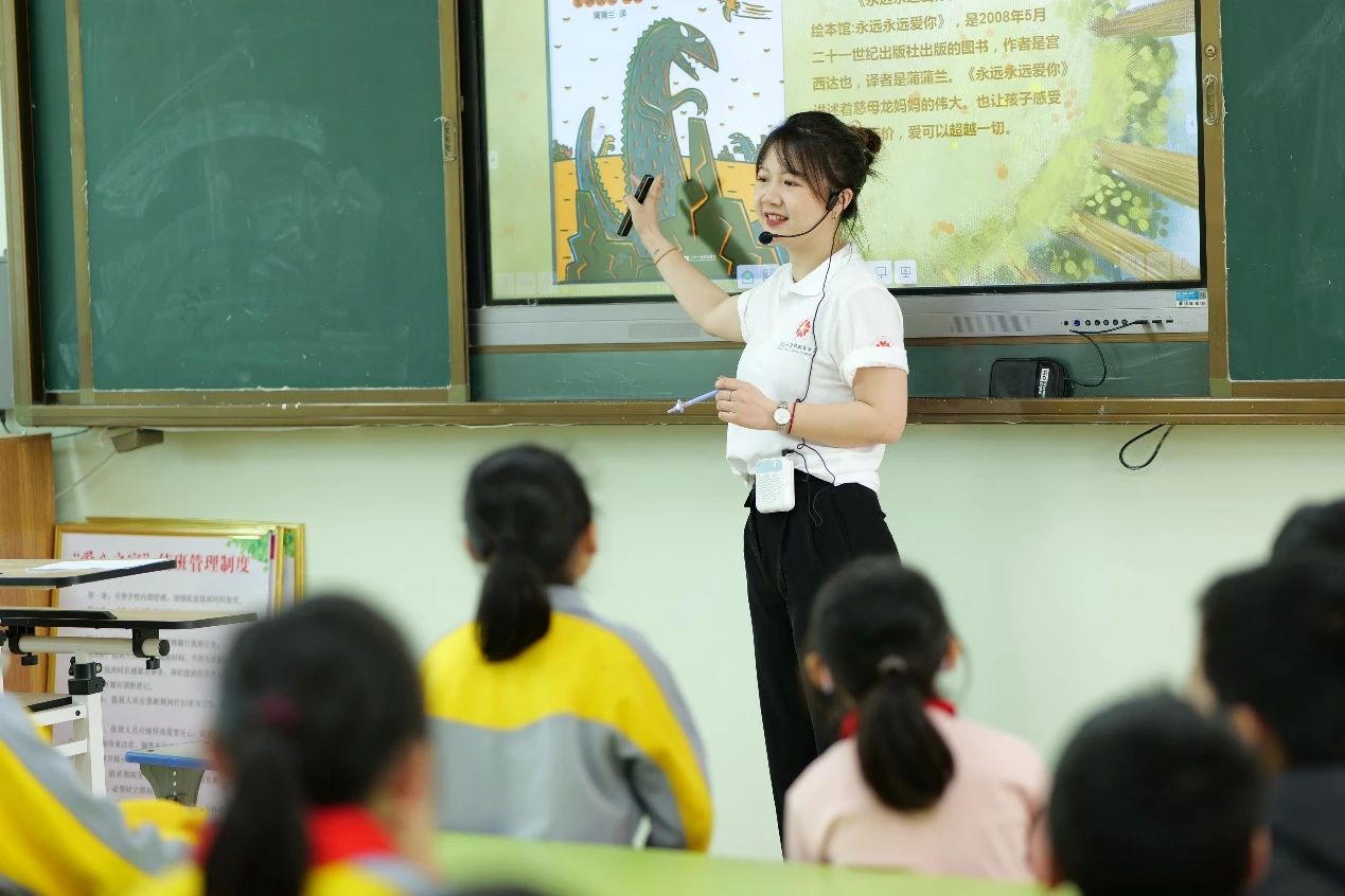 本次揭牌活动,基金会邀请了少儿剑桥英语培训讲师、少儿英语趣味课堂明星主讲人夏唯老师为留隍中心小学三年级的40名学生开展了一堂阅读课示范课。本次阅读示范课程选取了著名绘本《永远永远爱你》,讲述了慈母龙妈妈收养了一只霸王龙宝宝,并且抚养它长大的故事。