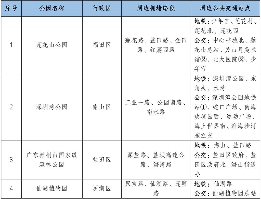 目前,深圳湾公园、莲花山公园、中心公园、笔架山公园、园博园、人民公园、儿童乐园、红岗公园、洪湖公园、皇岗公园、仙湖植物园、阳台山森林公园和马峦山郊野公园已开通线上预约停车位服务,建议有出游需求的市民提前预约。“五一”假期大鹏半岛、梅沙片区实施交通管制,启动预约通行措施。驾车前往该地区的市民须提前进行预约,按预约时间进入管制区域行驶,离开时间不受限制。