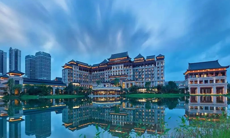 广州施柏阁大观酒店位于文旅城中心湖畔,其设计灵感源自岭南民国时期的官邸,空间布局讲究对称、庄重的仪式感。