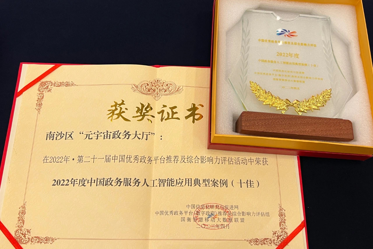 4月26日第二十一届中国优秀政务平台推荐及综合影响力评估总结大会在西宁召开,大会发布了《2022年中国优秀政务平台推荐及综合影响力评估结果通报》,南沙元宇宙政务大厅喜获“2022年度中国政务服务人工智能应用典型案例(十佳)”荣誉。