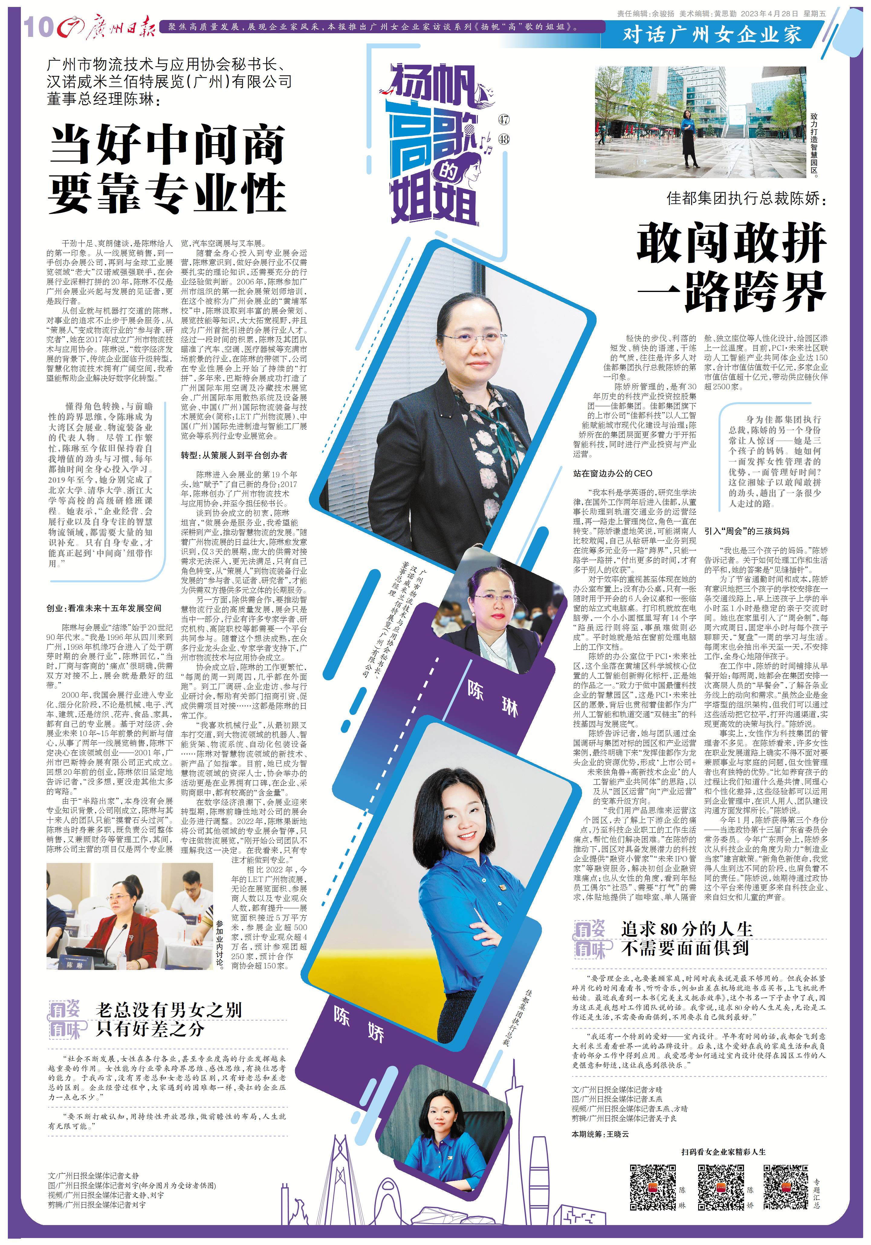 在数字经济浪潮下,会展业迎来转型期,陈琳前瞻性地对公司的展会业务进行调整。2022年,陈琳果断地将公司其他领域的专业展会暂停,只专注做物流展览,“刚开始公司团队不理解我这一决定。在我看来,只有专注才能做到专业。”