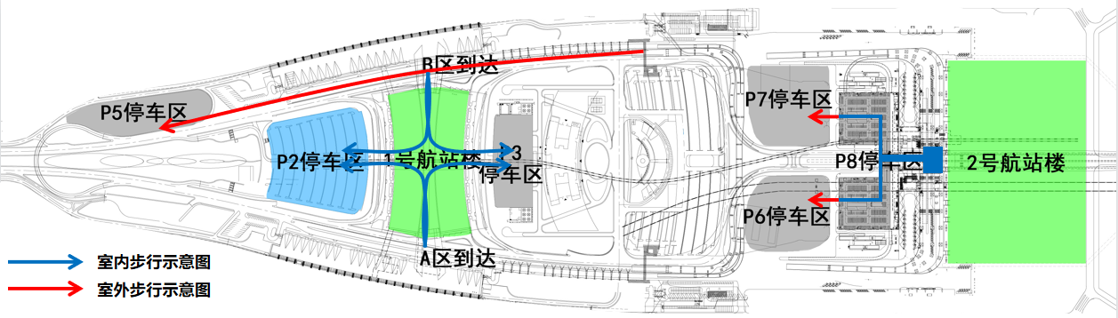 二号航站楼到达旅客可步行前往P6、P7、P8停车区上车(约3分钟至5分钟)。