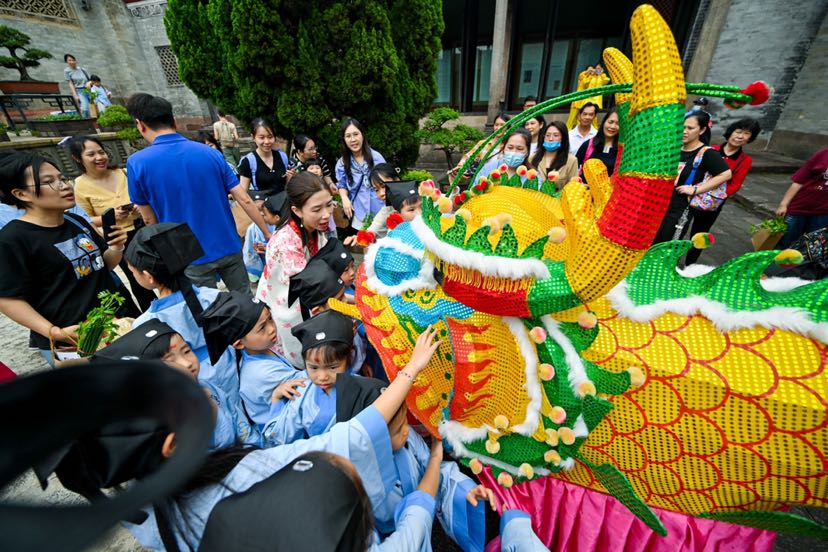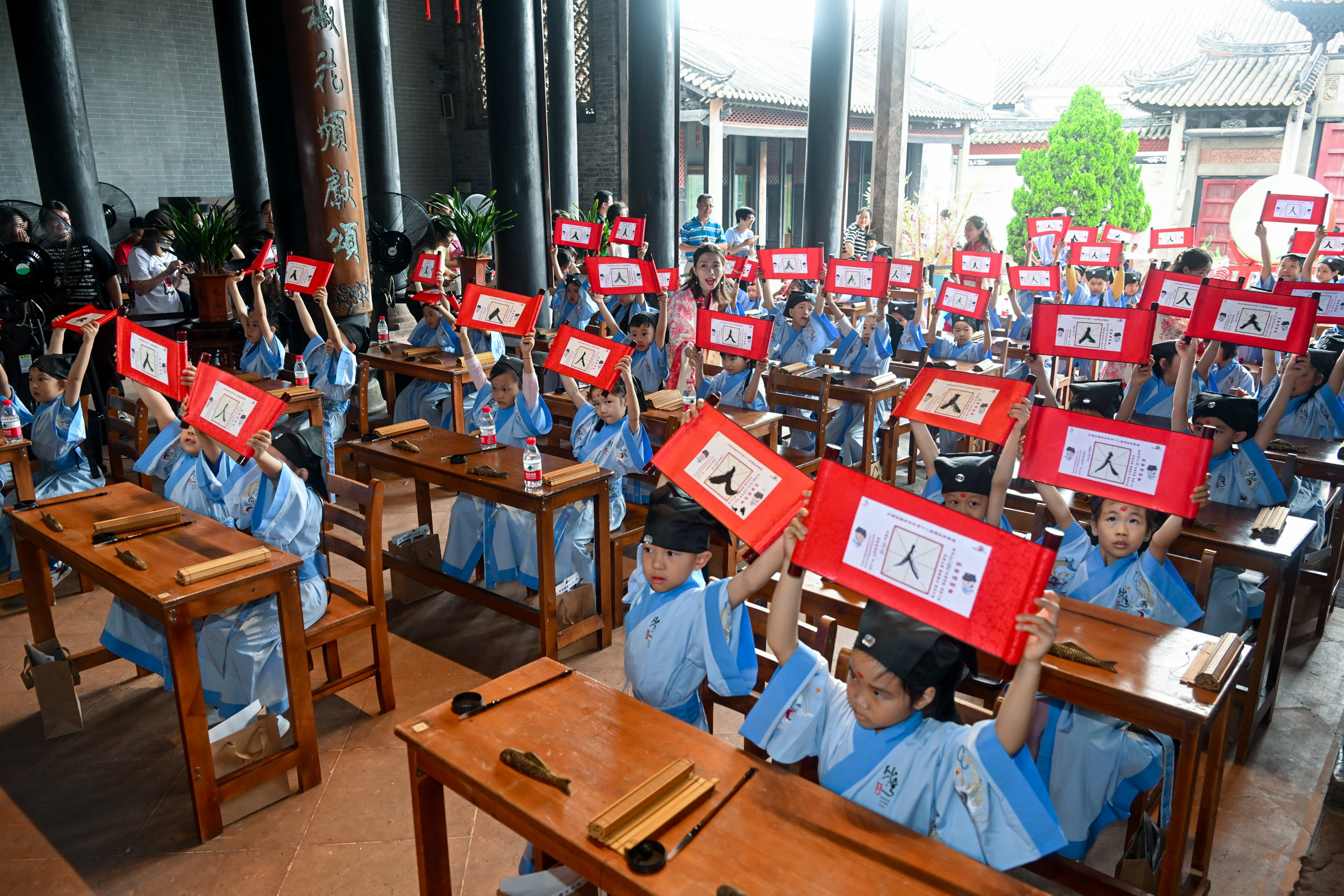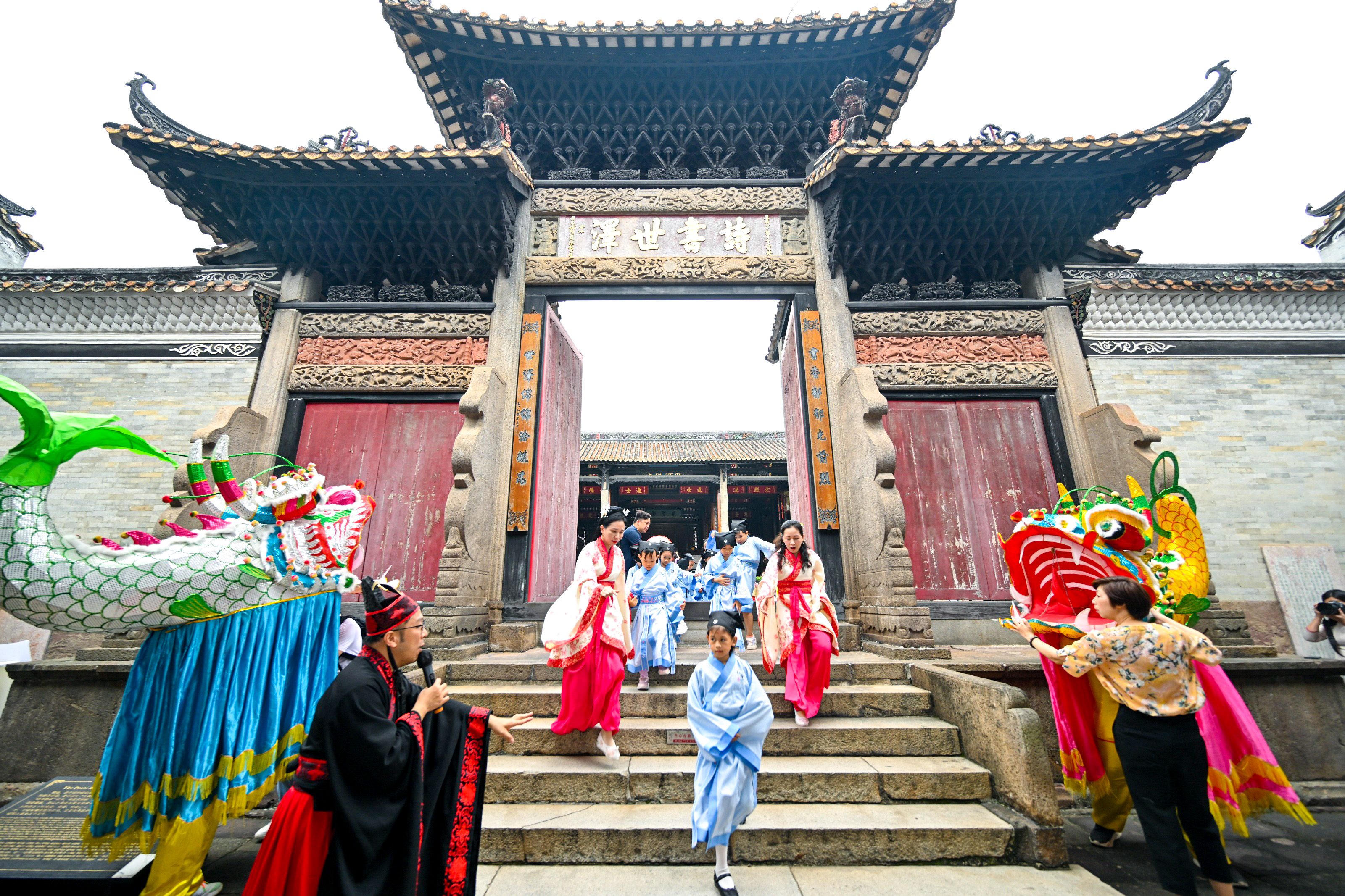 4月29日上午,2023广州市番禺区沙湾古镇癸卯年第十二届传统开笔礼首场活动在全国重点文物保护单位——留耕堂内举行。