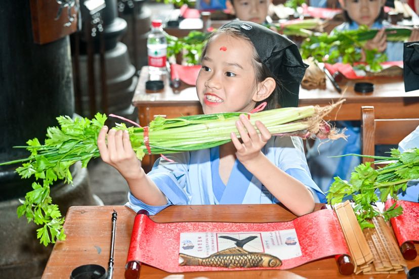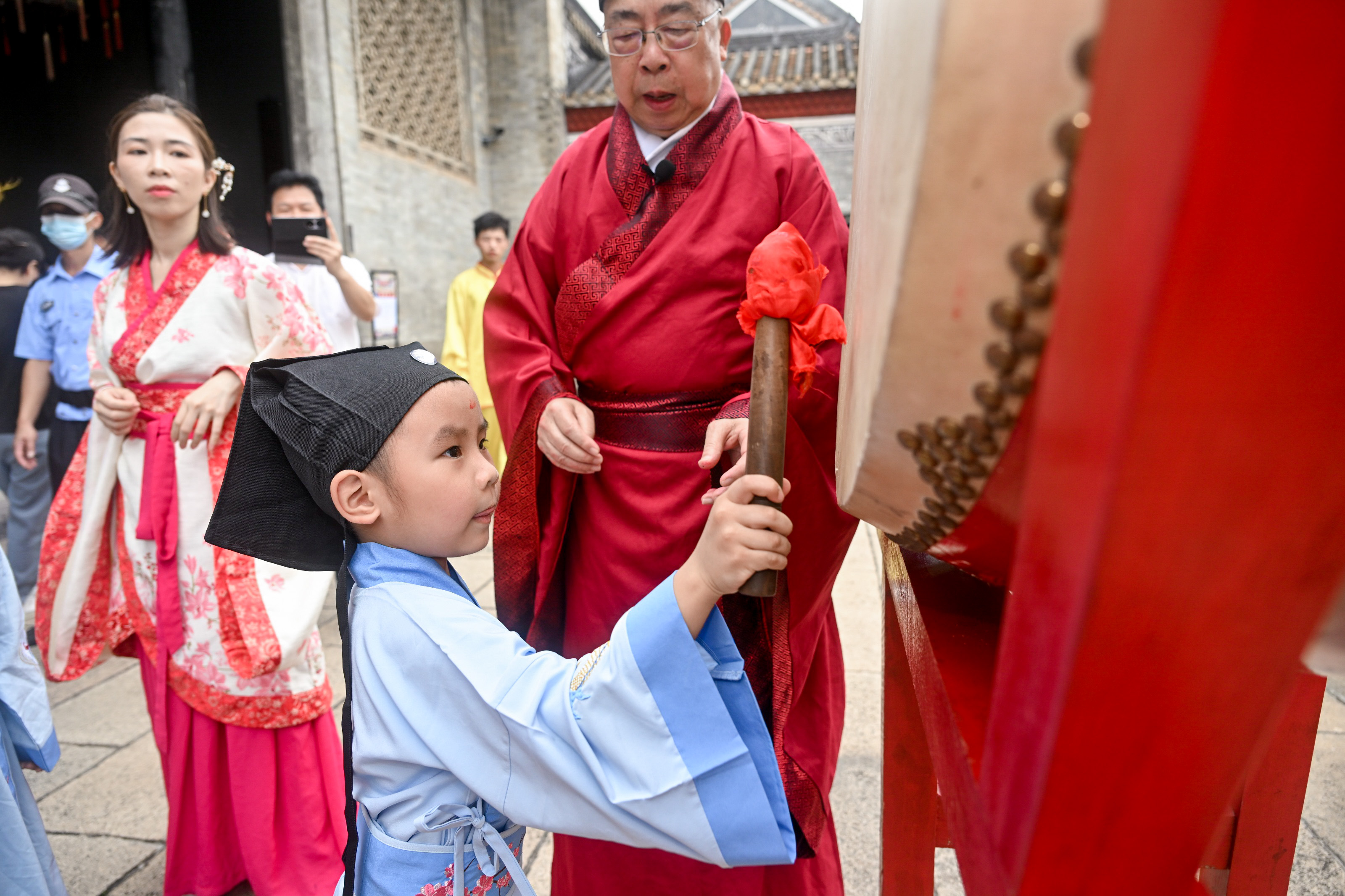 仪式中,随着司礼官梁谋先生一句“正衣冠”,开笔礼正式开始。47名萌娃参加开笔,孩子们宛若乖巧的学童,以全新的面貌来迎接接下来的仪式。用毛笔手写第一个“人”字,代表着要读书首先学会做人,这正是开笔礼要传达和教育的重要内容。“击鼓明志,茅塞顿开”,随着司礼官的擂鼓声,本次活动被推上了高潮。萌娃们志存高远,鼓声响亮,梦想闪亮。