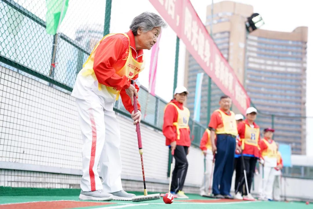 这是由中共广州市委老干部局主办的“银映红棉出新彩”——2023年广州市老干部门球赛现场。比赛共有12支参赛队伍,100余名老干部运动员参加比赛。比赛不设年龄限制,于是出现了很多“资深运动员”,甚至有两位年过九旬的“90后”老大姐也上阵当起了主力。她们表示,门球运动非常适合老年人,运动起来能感觉到还非常年轻,只要还能动就会一直打下去。
