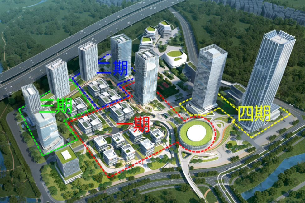 为方便管理和高效建设,项目分成四期开展施工。一期包含会展中心、独栋及合院办公楼和超高层写字楼,二期包含公交站、合院办公楼和地上连廊,三期为幼儿园、公寓住宅芯片技术产业楼和高档酒店,四期为2栋超高层内含五星级酒店、博物馆、办公楼和高端公寓。