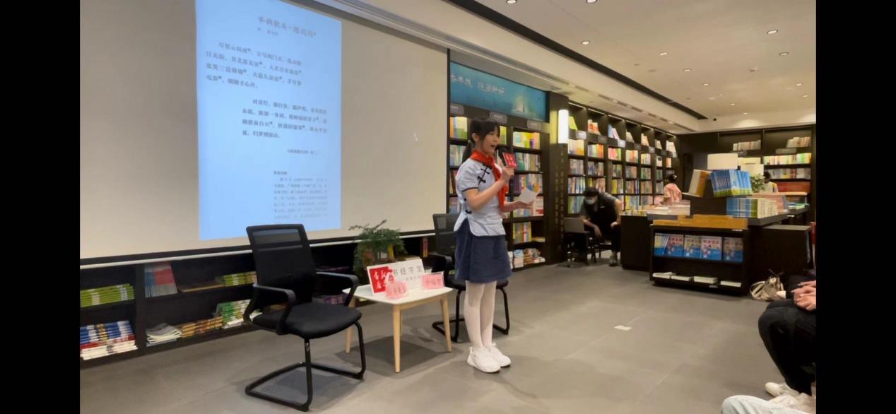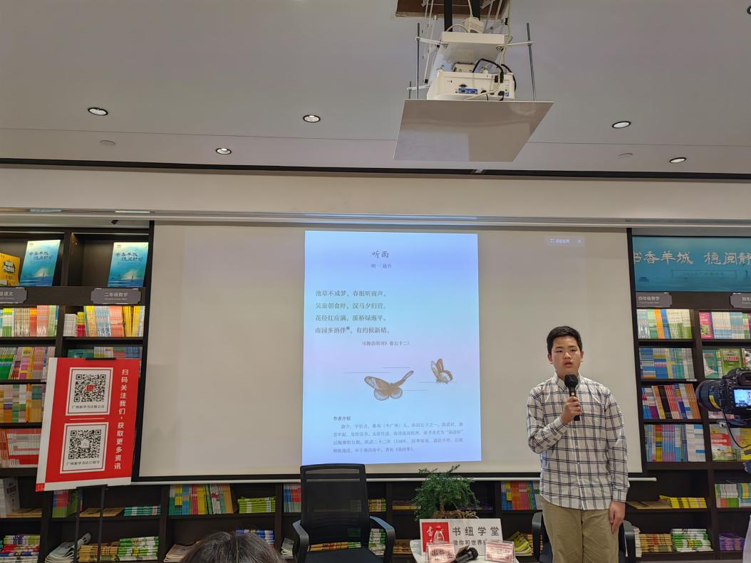 以诗词之美相聚,以广府风情相融,在活动现场,第五届广州诗词挑战赛少儿组状元,来自天河中学初二年级的裴子睿同学以普通话朗诵了明代赵介的《听雨》,而来自小北路小学六年8班的梁恩喻同学则用粤语朗诵了宋代崔与之的《水调歌头·题剑阁》。两位老师对朗诵做出点评,并详细分析了诗词的平仄韵律之美,带领读者感受古人创作时的真情实意。