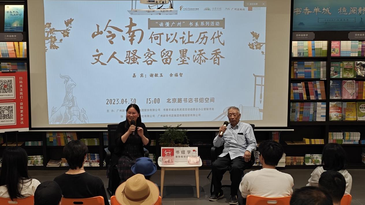 由广州新华出版发行集团股份有限公司、书香羊城全民阅读活动组委会办公室秘书处主办,广州出版社有限公司、广州新华书店集团传媒连锁有限公司协办的“读懂广州”书系系列活动第三场“岭南何以让历代文人骚客留墨添香”在新华书店(北京路书店)三楼书纽空间举行。“读懂广州”书系之《文学里的广州·诗词》主编谢敏玉、余福智两位嘉宾为读者梳理广州悠久的诗歌源流,展示广州诗词文化脉络,带领观众从诗词中感受广州的诗性城市内涵。