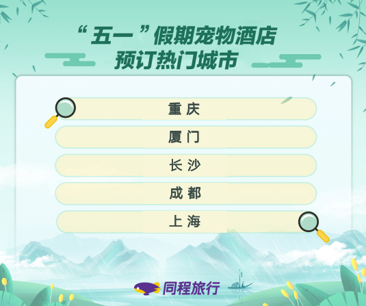 这个“五一”假期还有不少游客选择带着宠物一起去旅行,同程好住榜在全国37座城市推出宠物友好酒店榜单,为带着宠物的旅行者提供了更加方便快捷的选择。数据显示,节前这些宠物友好酒店的预订量,同比增长超过100%。重庆、厦门、长沙、成都和上海,是人们最爱携带宠物前往的城市。