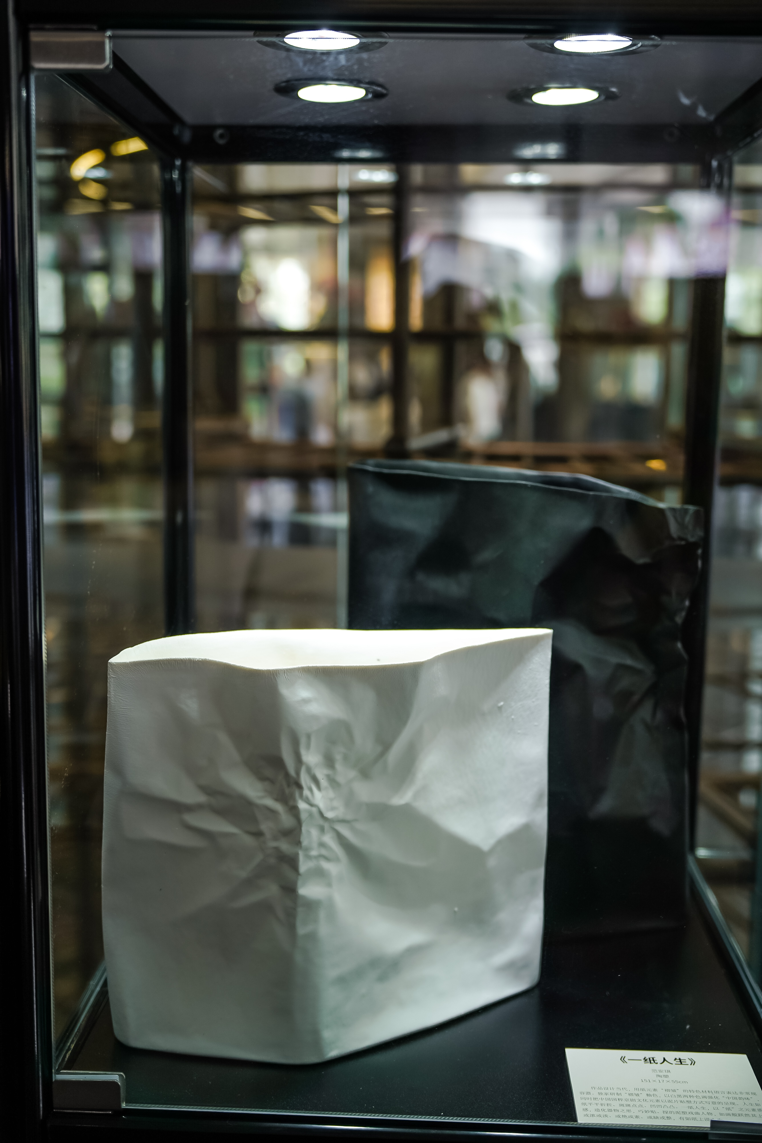 陶塑《一纸人生》,由中国工艺美术大师范安琪创作,其独家研制“褶皱”釉色制成,以白黑两种色调强化“中国韵味”,以泥片贴塑方式写意呈现了中国国粹京剧文化元素。