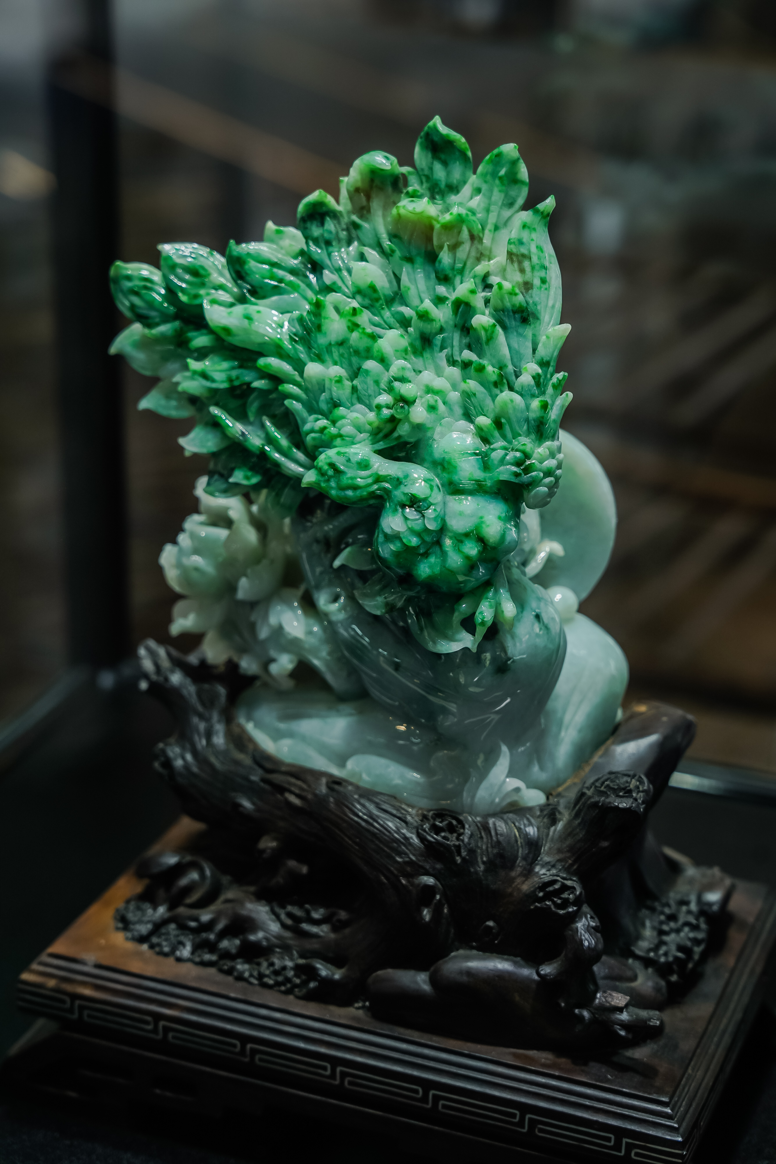 玉雕《凤仪天下》,由中国工艺美术大师叶福欢所作,妙用翡翠上星星点点的翠绿,运用圆雕、浮雕等技艺,将其雕刻成展翅欲飞的凤凰,羽翼丰盈而细节精致,尽显凤凰、牡丹之贵态,体现出岭南玉雕独有的讲究。