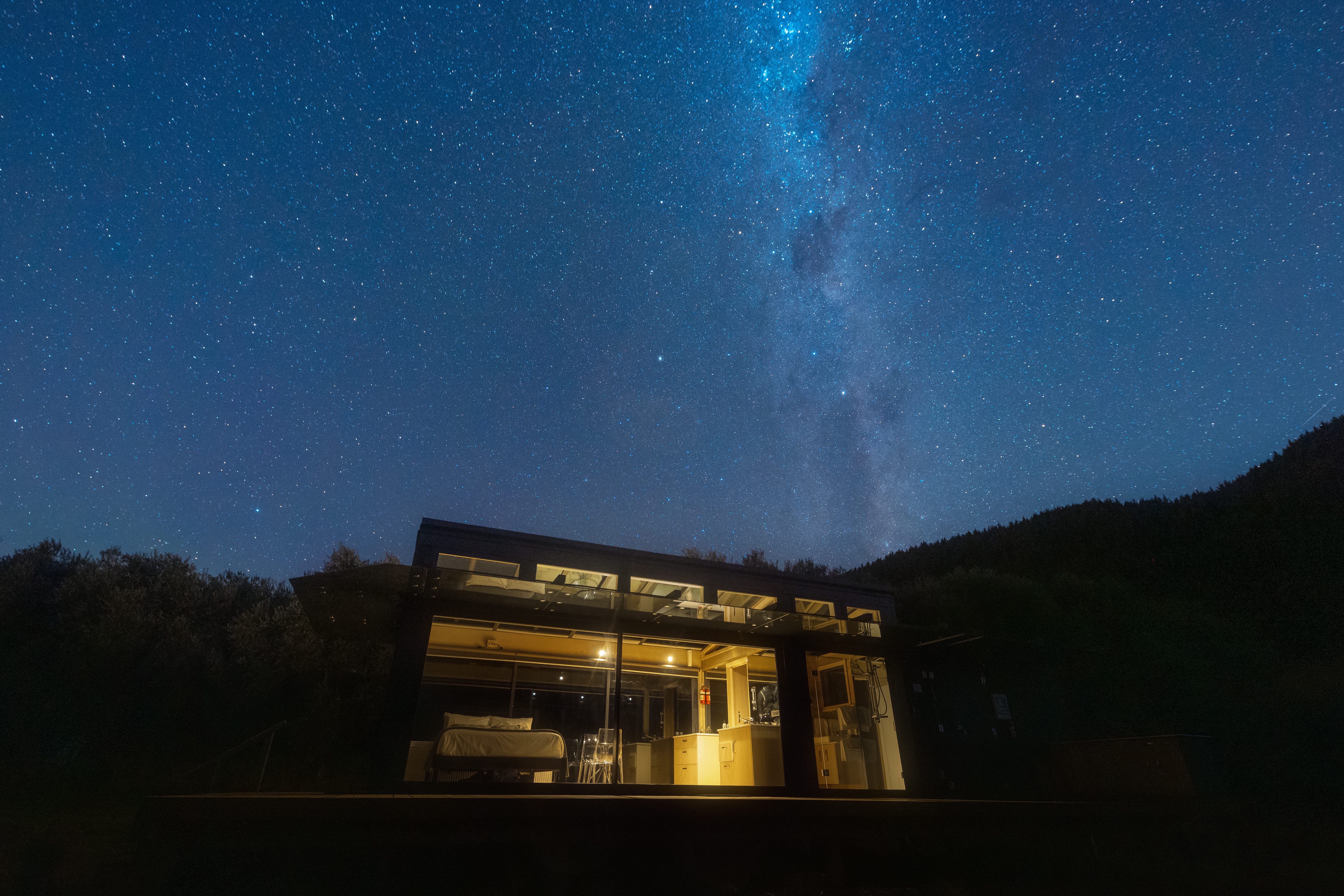 夜空银河如练。当地许多酒店、旅馆和民宿都有定制建筑,让人可以用舒适姿势仰望夜空,在星空下安眠。PurePod是360°全方位景观特色连锁生态玻璃小屋,共11座,分散坐落于新西兰各处远离喧嚣的小镇,皆能欣赏到令人惊叹的夜空美景,并配有望远镜用于观鸟和观星。如果足够幸运,甚至可以在入夜后捕捉到绚烂的南极光美景,当然,时间是有限定的,通常在每年的三月到九月期间。
