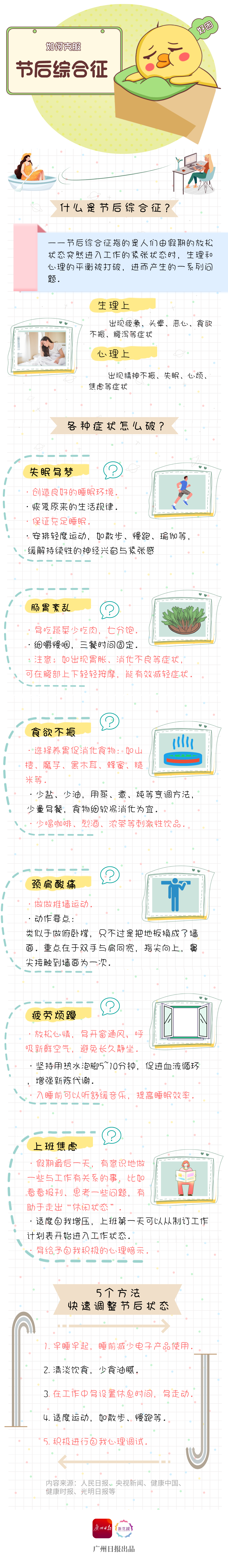 每每假期结束,你是否会有失眠困倦、肠胃紊乱、肩颈酸痛等各种各样的节后综合征?究竟什么是节后综合征?节后综合征有哪些症状?如何快速应对?小长假即将结束,一图教你如何克服节后综合征,助你调整生活节奏,迅速回归工作。