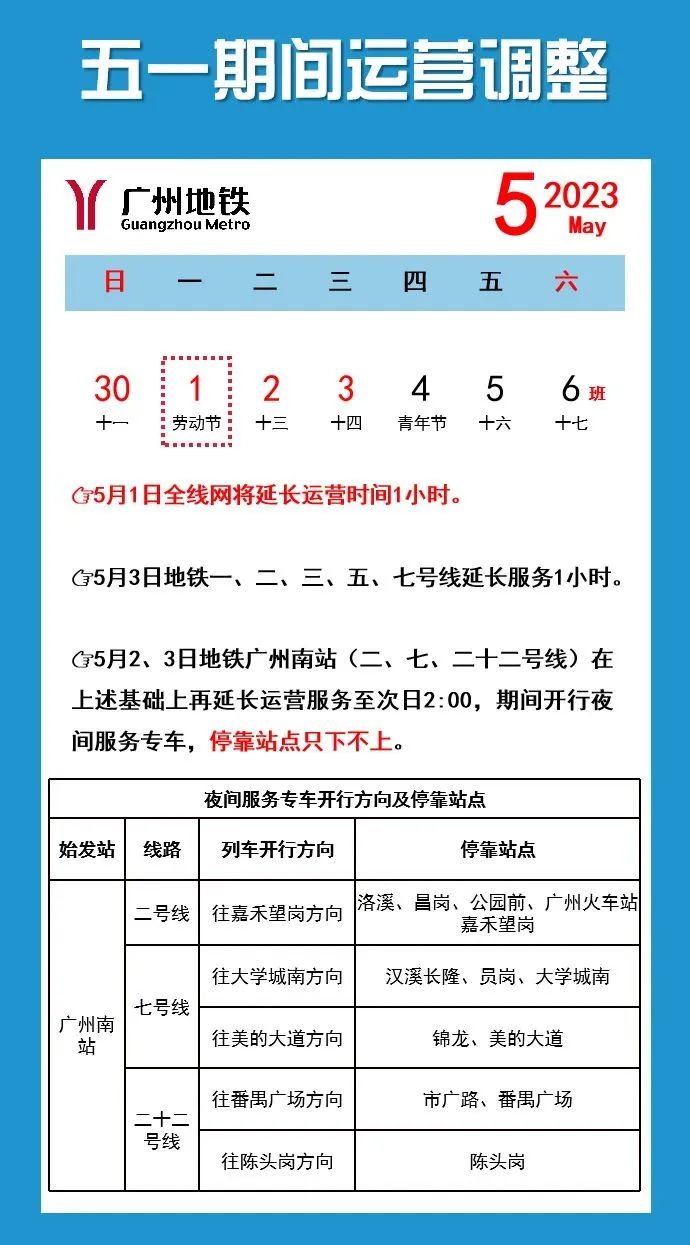 •5月2、3日,地铁广州南站(二、七、二十二号线)在上述基础上再延长运营服务至次日2:00,期间开行夜间服务专车,停靠站点只下不上。