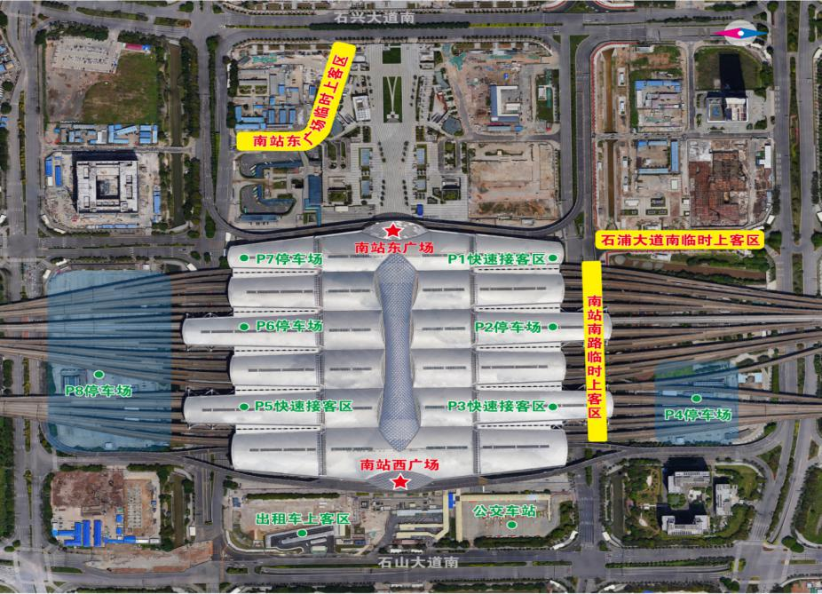 为解决广州南站地区“五一”小长假期间社会车辆接客车位不足的问题,方便旅客快速离站,4月28日至5月4日期间,在南站南路西往东方向右侧车道、南站东广场顺怡北街全路段、石浦大道南双向右侧车道设置临时上客区。