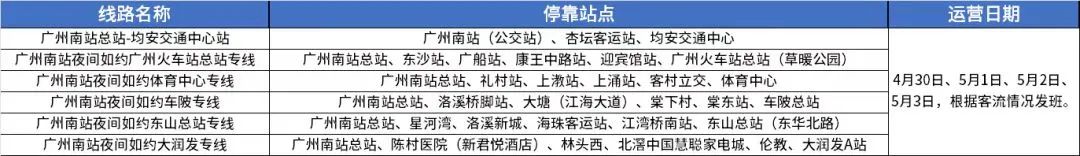 为了让市民安心回家,广州公交集团将持续关注广州南站的客流情况,计划在5月2日、5月3日期间开行6条定制公交线路,并在5月3日、4日两天凌晨,根据现场客流情况加密发车班次。