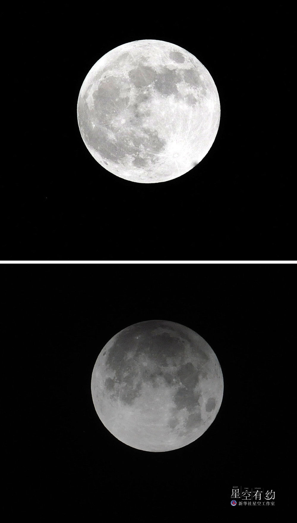 这是2012年11月28日晚在北京拍摄的月亮。上图:20时13分半影月食开始时的月亮;下图:22时02分的月亮,虽然月光暗了,但月球表面层次却增加了。新华社记者何俊昌 摄