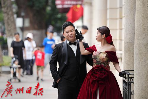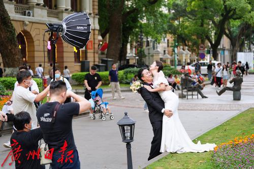 2023年5月3日,一对新人在广州沙面公园拍摄婚纱照。