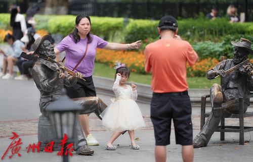 2023年5月3日,市民游客在广州沙面公园打卡拍照。