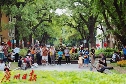 2023年5月3日,广州天气晴好,市民游客在沙面公园游玩。