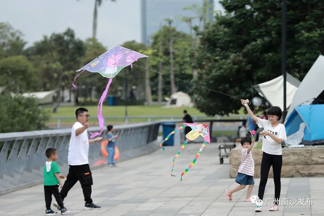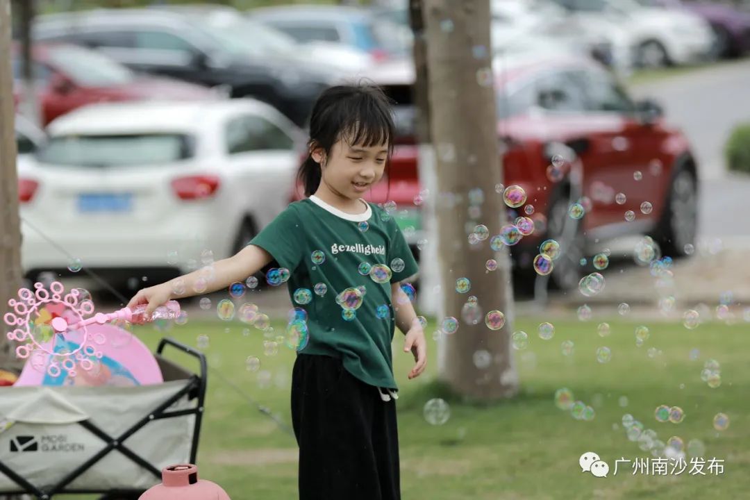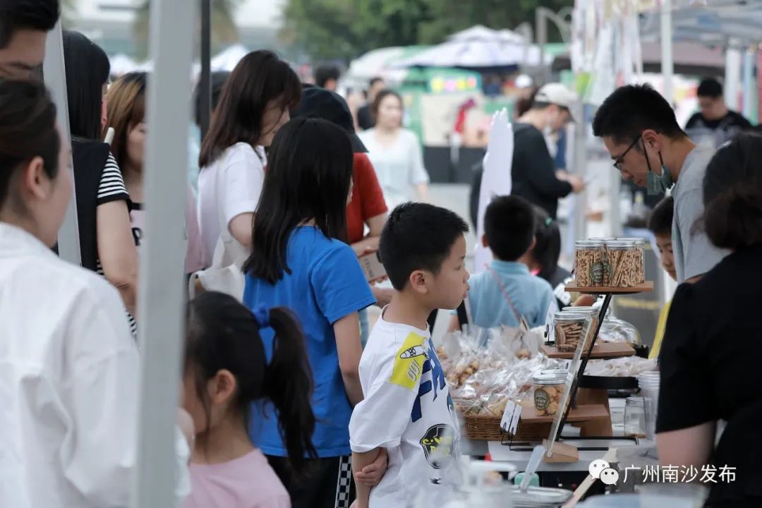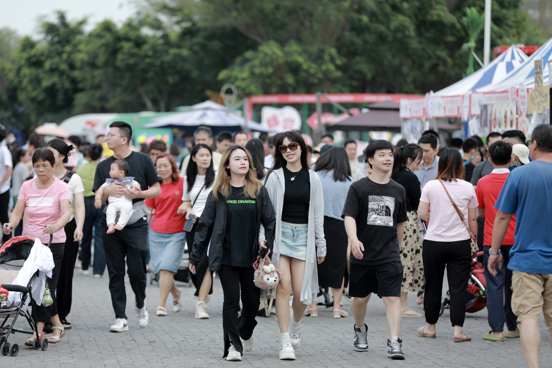 在南沙中交国际邮轮广场,南沙湾区露营文化旅游季活动现场,游客品尝着南沙、从化的美食和特产,自行车杂技表演、泡泡秀引发一浪又一浪欢呼声;车尾箱市集、文创摊位前人头攒动、热闹非凡。