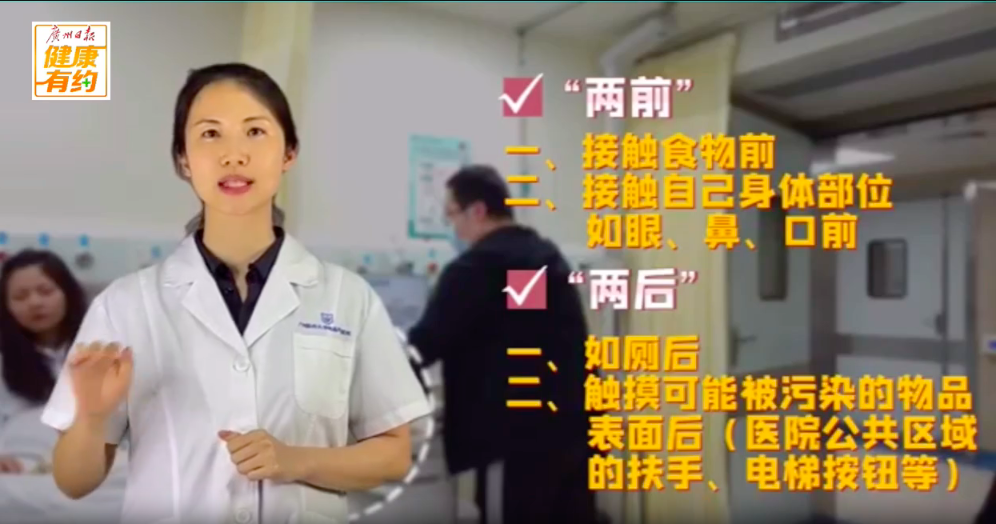 广州医科大学附属肿瘤医院预防保健科医师黄芊芊提醒,“两前”“两后”应注意清洁好双手: