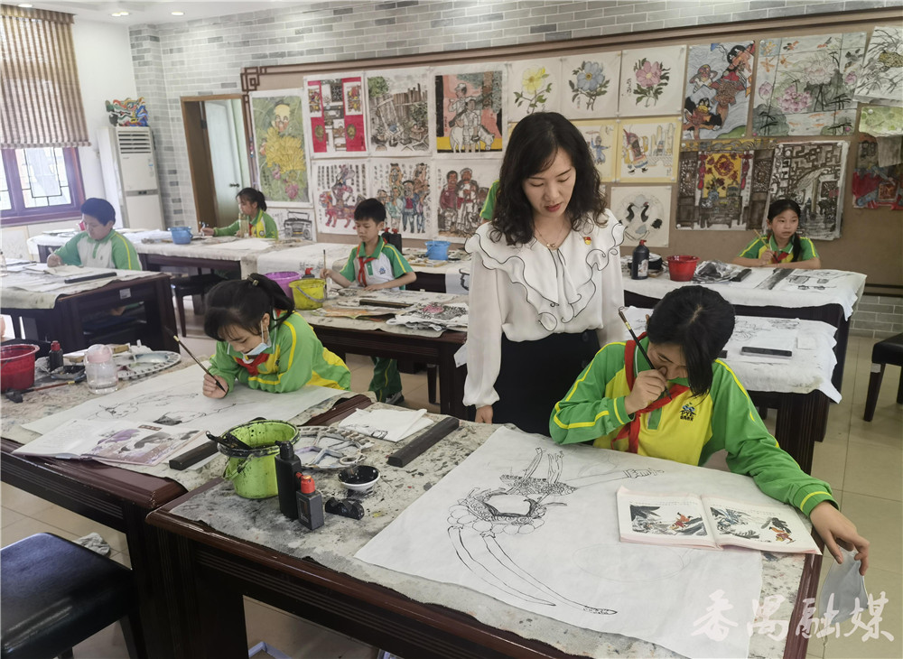 同时,书画舍坚持利用每天的大课间和下午第三节课组织培训,在现场记者看到,孩子们有的对着画册临摹经典,也有孩子画自己感兴趣的题材。辅导老师不时对他们加以技巧和方法上的点拨。而即使在假期,学校对孩子们的培训也并未中断,学校建立了画舍群,在周末或者假期,孩子们如果有感兴趣的题材,辅导老师会给他们找资料和画册让他们去画,对发上群里的画作,老师也会进行指点。