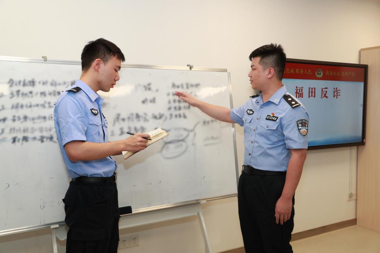 去年10月,刚从警校毕业的青年新警邓竣升就来到了福田公安分局反诈办,在这里,他巧遇了同为广东警官学院毕业的“90后”师兄陈仁泽,在师兄的带领下,邓竣升正快速成长成为反诈阵地的主力。