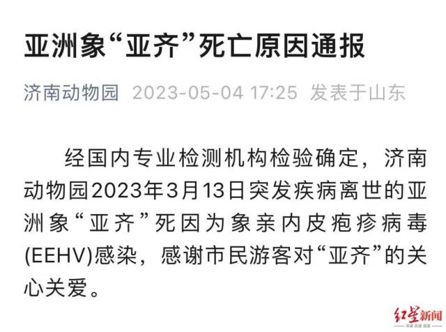 5月4日,济南动物园通报“亚齐”死亡原因,经国内专业检测机构检验确定,3月13日突发疾病离世的亚洲象“亚齐”,死因为象亲内皮疱疹病毒(EEHV)感染。