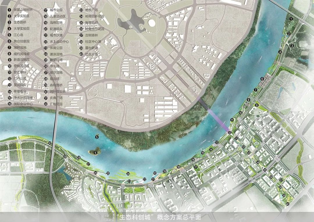 优胜方案“生态科创城”具有强烈的滨江特色,旨在建立弹性、多样化的生态基础设施,传承岭南文化,保护和再利用工业遗存,提供丰富的户外设施,创造具有现代岭南特色的开放交流协作平台。方案的景观架构由一轴一带组成。中轴景观延续了广州大学城的轴线,充分融合岭南文化和生活方式,植入多样化的生活、工作场景,通过跨越城市干道的生态路桥强化中轴腹地与滨水空间的连接;在滨江绿带设计连续的生态栖息地及社区公园,并提出一系列工业遗存再利用的创新策略。