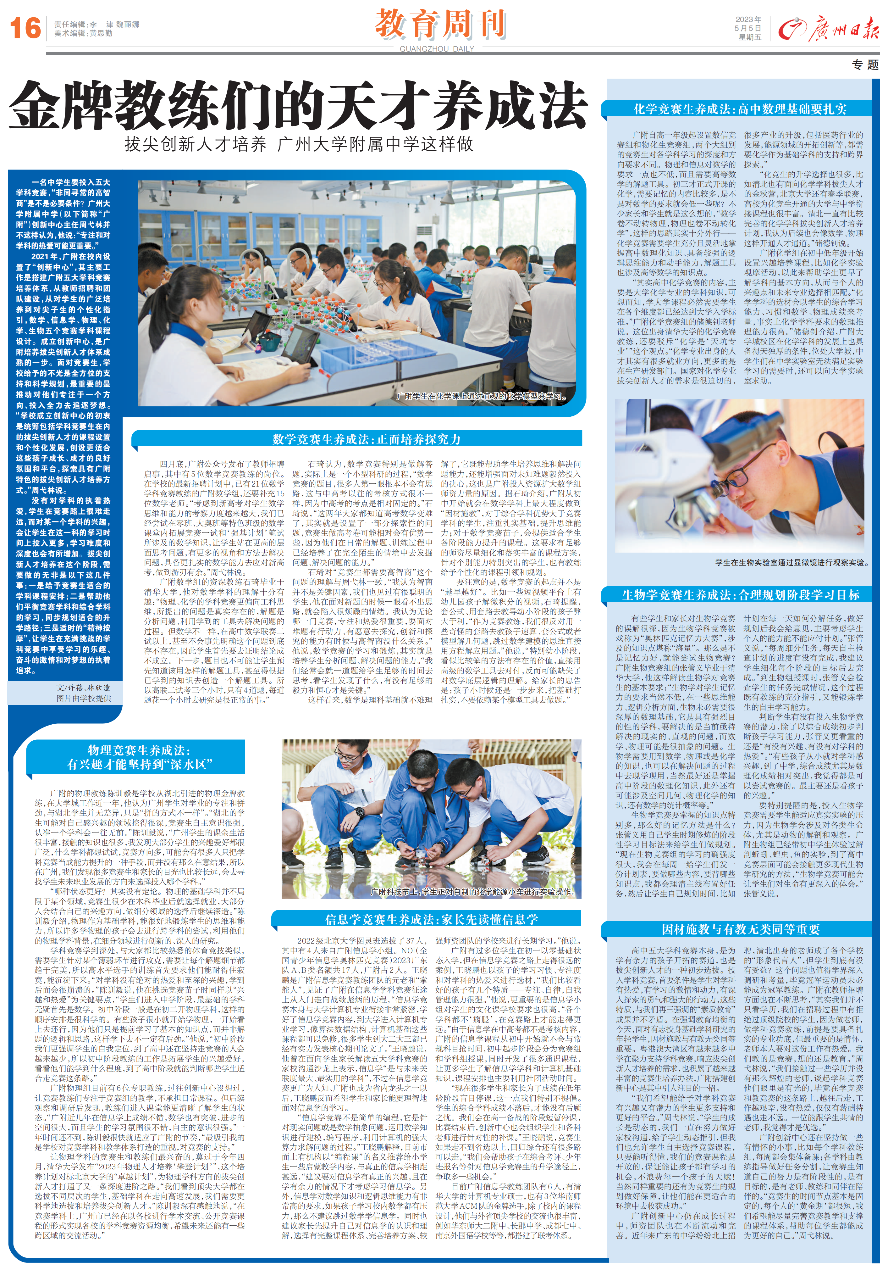 高中五大学科竞赛本身,是为学有余力的孩子开拓的赛道,也是拔尖创新人才的一种初步选拔。投入学科竞赛,首要条件是学生对学科有热爱,有学习的激情和动力,有深入探索的勇气和强大的行动力,这些特质,与我们再三强调的“素质教育”成果并不矛盾。在强调教育均衡的今天,面对有志投身基础学科研究的年轻学生,因材施教与有教无类同等重要。粤港澳大湾区有越来越多中学在聚力支持学科竞赛,响应拔尖创新人才培养的需求,也积累了越来越丰富的竞赛生培养办法,广附搭建创新中心是其中引人注目的一招。