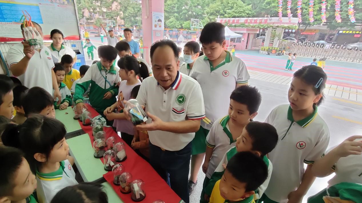 广州市从化区恒善禁毒协会会长杨伟根为河滨小学师生展示仿真毒品模型,增强防毒意识。通讯员供图