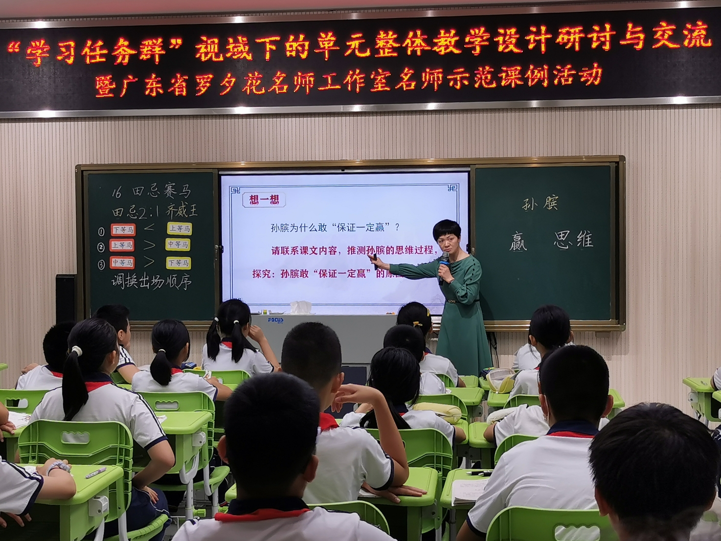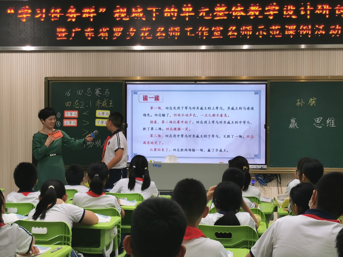 在课例示范中,罗夕花展示了五年级下册第六单元的第16课《田忌赛马》课例。这一单元的学习要素为“了解人物的思维过程,加深对课文内容的理解”。她以“思维”作为切入点,引导学生回顾单元主题,明晰单元核心目标,即“阅读思辨类文章,了解人物的思维过程,学习思考问题的方法,能根据实际情况选择恰当的办法解决生活中的问题”。